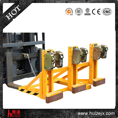 重型三油桶夾具單鷹嘴純機(jī)械機(jī)構(gòu)設(shè)計可與叉車方便地配合,僅依靠叉車的動作,不需要其它的動力,可自動一次搬運(yùn)3個塑料油桶, 配置可拆換式柔性耐磨保護(hù)墊,有效保護(hù)油桶并緩沖叉車行駛過程中的震動, 能在集裝箱等這樣狹小的環(huán)境內(nèi)裝卸桶裝物質(zhì),可極大地提高空間利用率, 與貨叉連接配有自鎖裝置確保油桶夾在坡度上和顛簸路面使用時不會滑落.